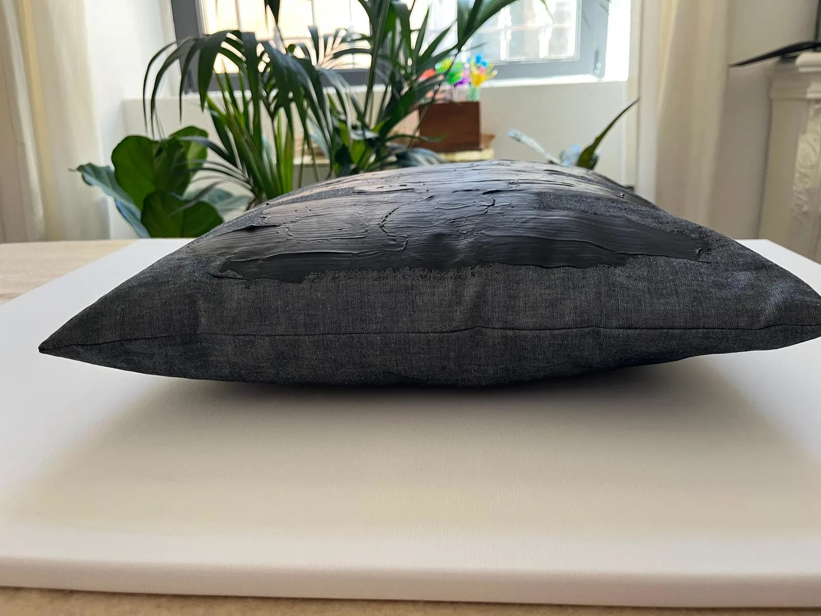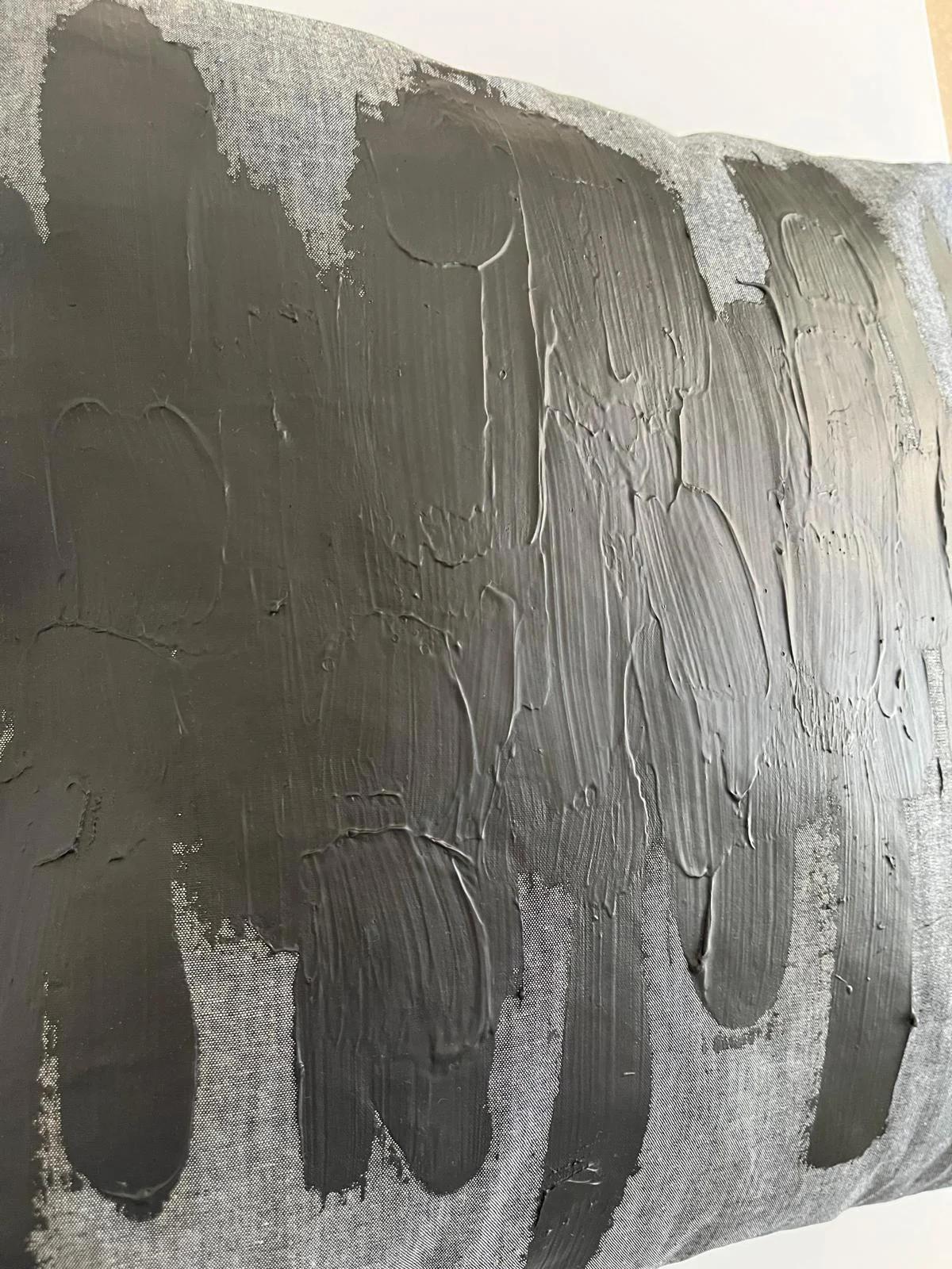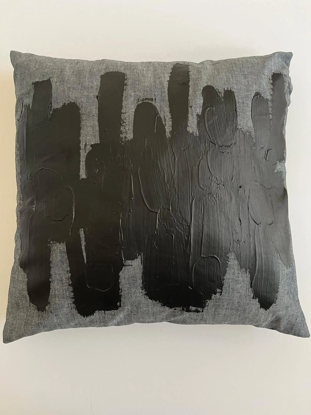 Cuscino dipinto con gomma liquida nera , tessuto Oxford di cotone(scrivilo su tutti e tre scusa!!) grigio lavorazione decolorazione spray, interno in polifil incluso. Misure 40×40 cm.