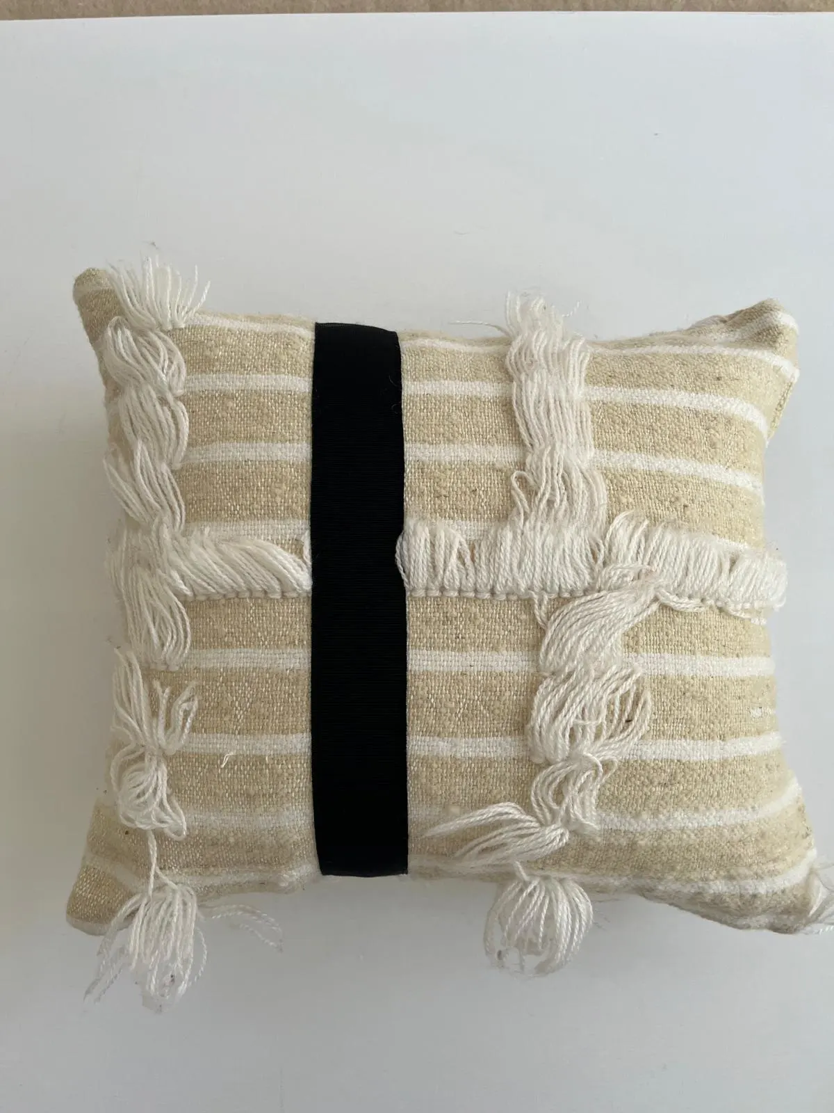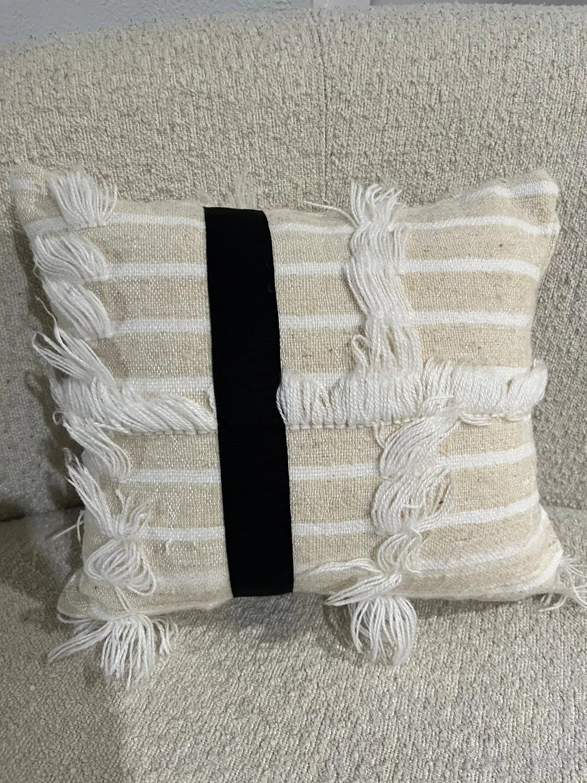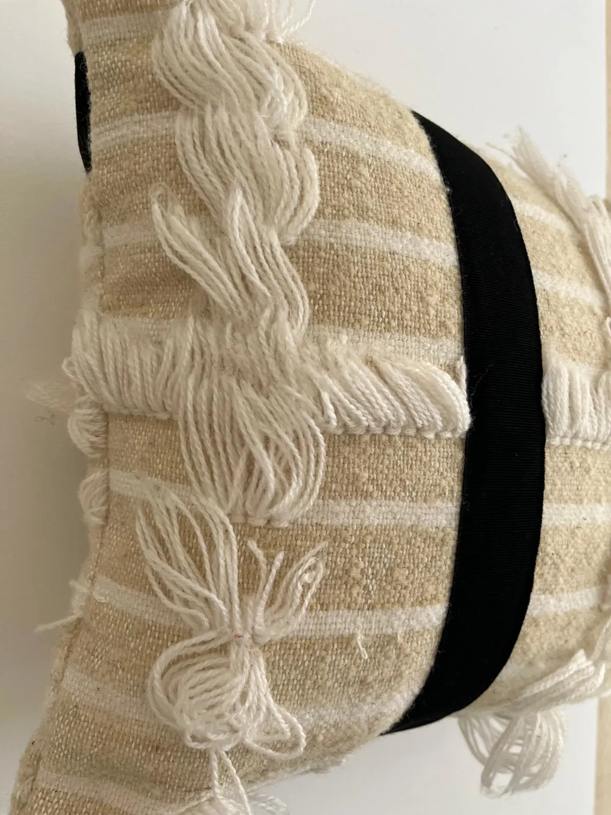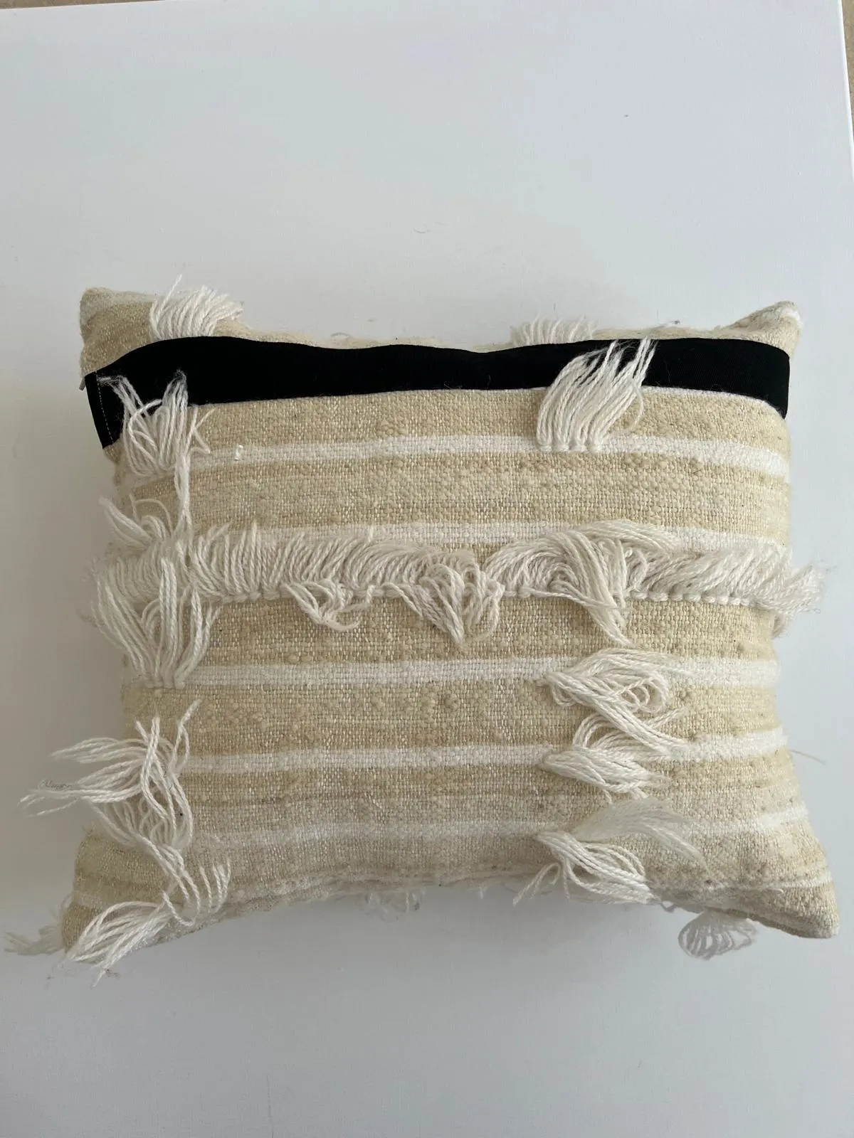 Cuscino recycle da Handira Marocchina ricamata bicolore in lana, applicazione di doppia banda in caneté nero. Interno in polifil incluso. 40x35cm.