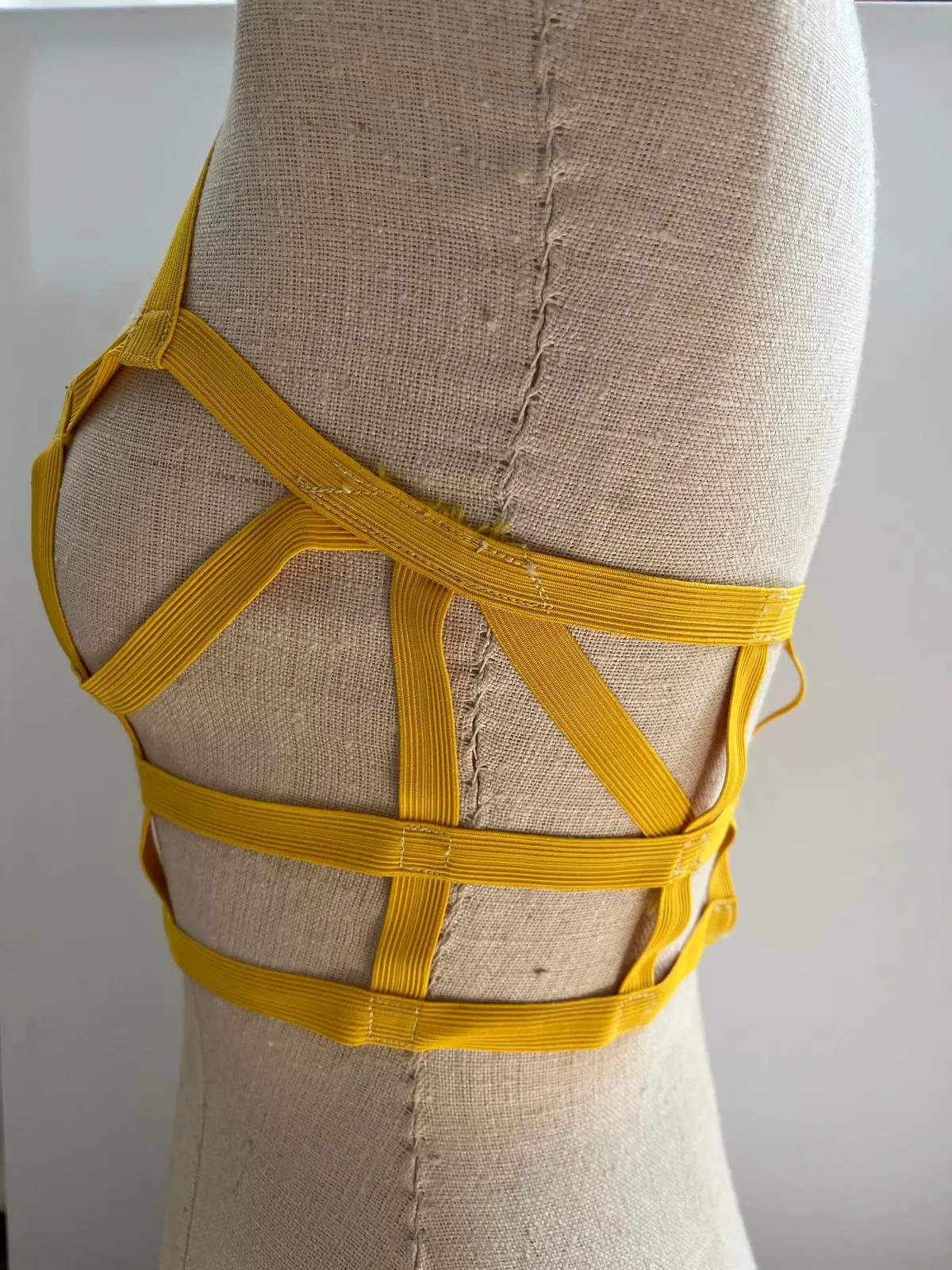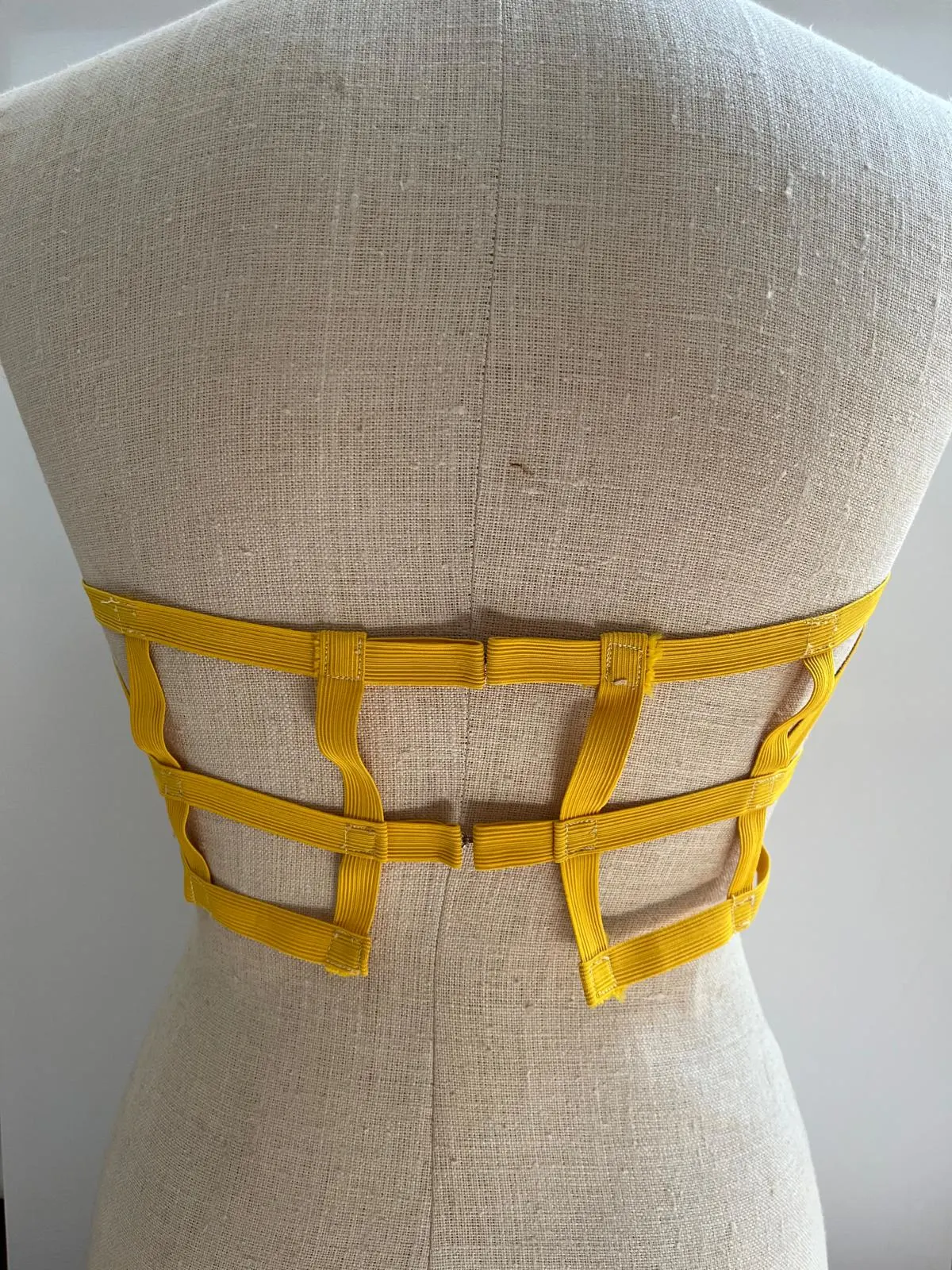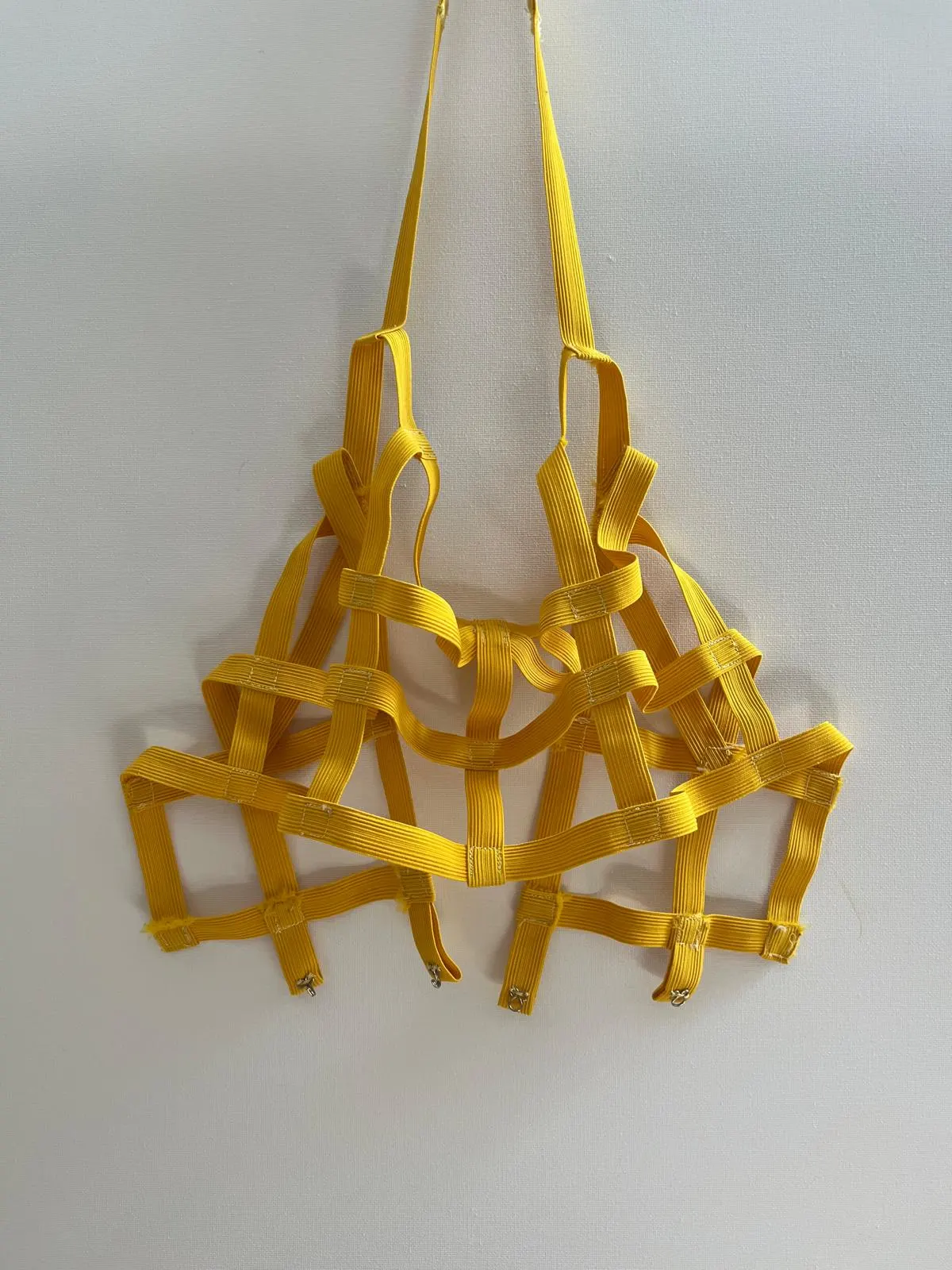 Accessorio Moda realizzato con fettucce in elastane gialle. Chiusura a gancetti. Taglia M seno 1/3.