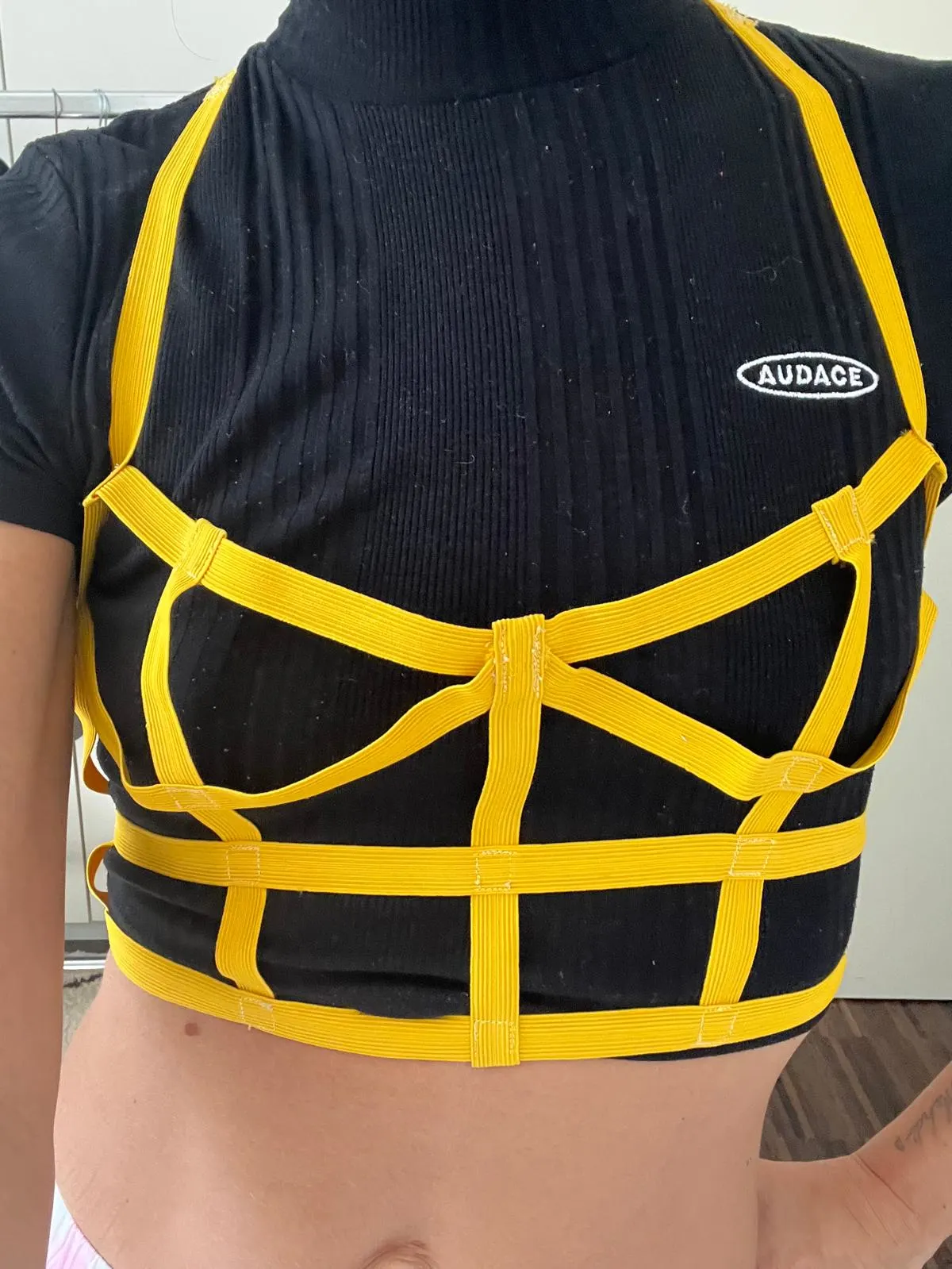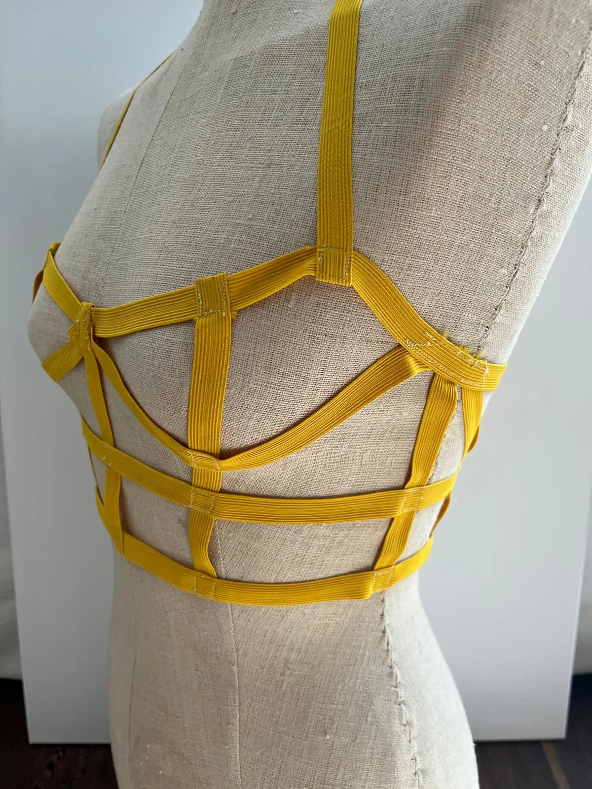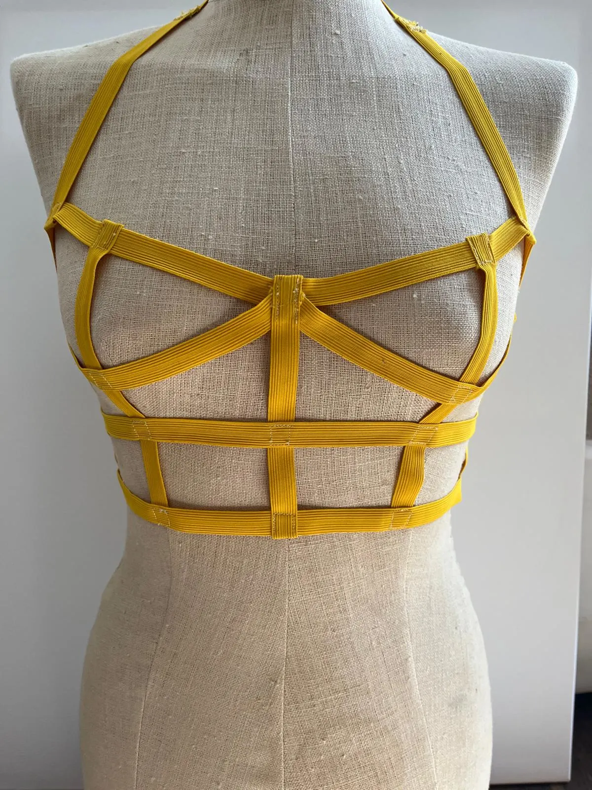 Accessorio Moda realizzato con fettucce in elastane gialle. Chiusura a gancetti. Taglia M seno 1/3.